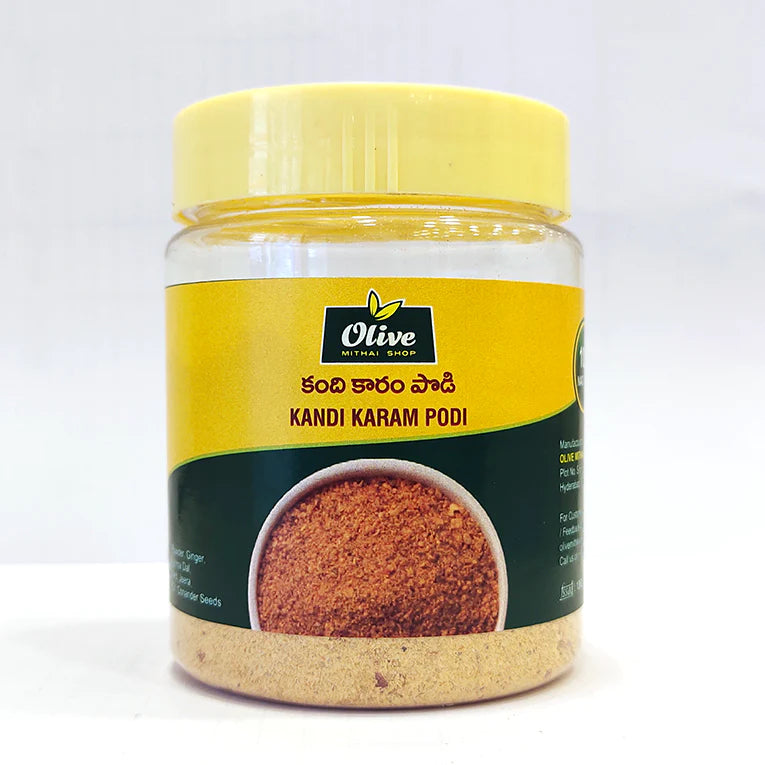 Kandi podi is prepared with a combination of the Kandi pappu and senaga pappu, dry roasted red chillis along with other spices.
